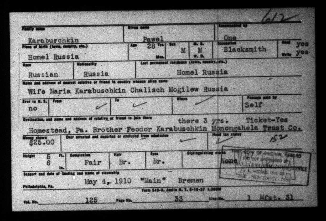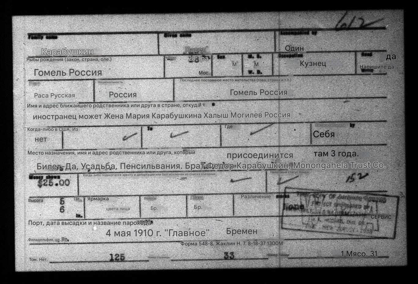 И он там нашёлся! Это позволило установить дату его приезда в США – 4 мая 1910 года из Бремена (либо название парохода «Бремен»). Из других сведений о пассажире можно узнать, что он кузнец по профессии. Прибыл из Хальча. Жена – Мария. Последнее постоянное место жительство, видимо, указанное им, – Гомель.