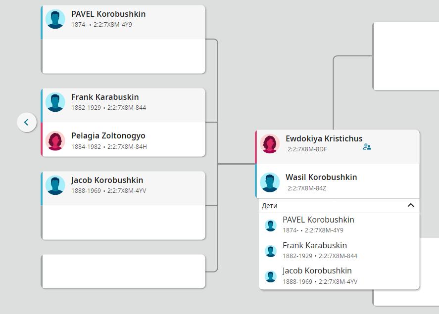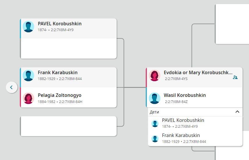Примечательно, что ссылка на Якова Коробушкина на сайте «Семейный поиск» отрывается только тогда, когда жена у Василия Коробушкина – Евдокия Кристичус. Тогда в дереве появляются Павел, Франк и Яков. Если жена у Василия Коробушкина Евдокия или Мария, то их дети – только Павел и Франк, Якова нет.