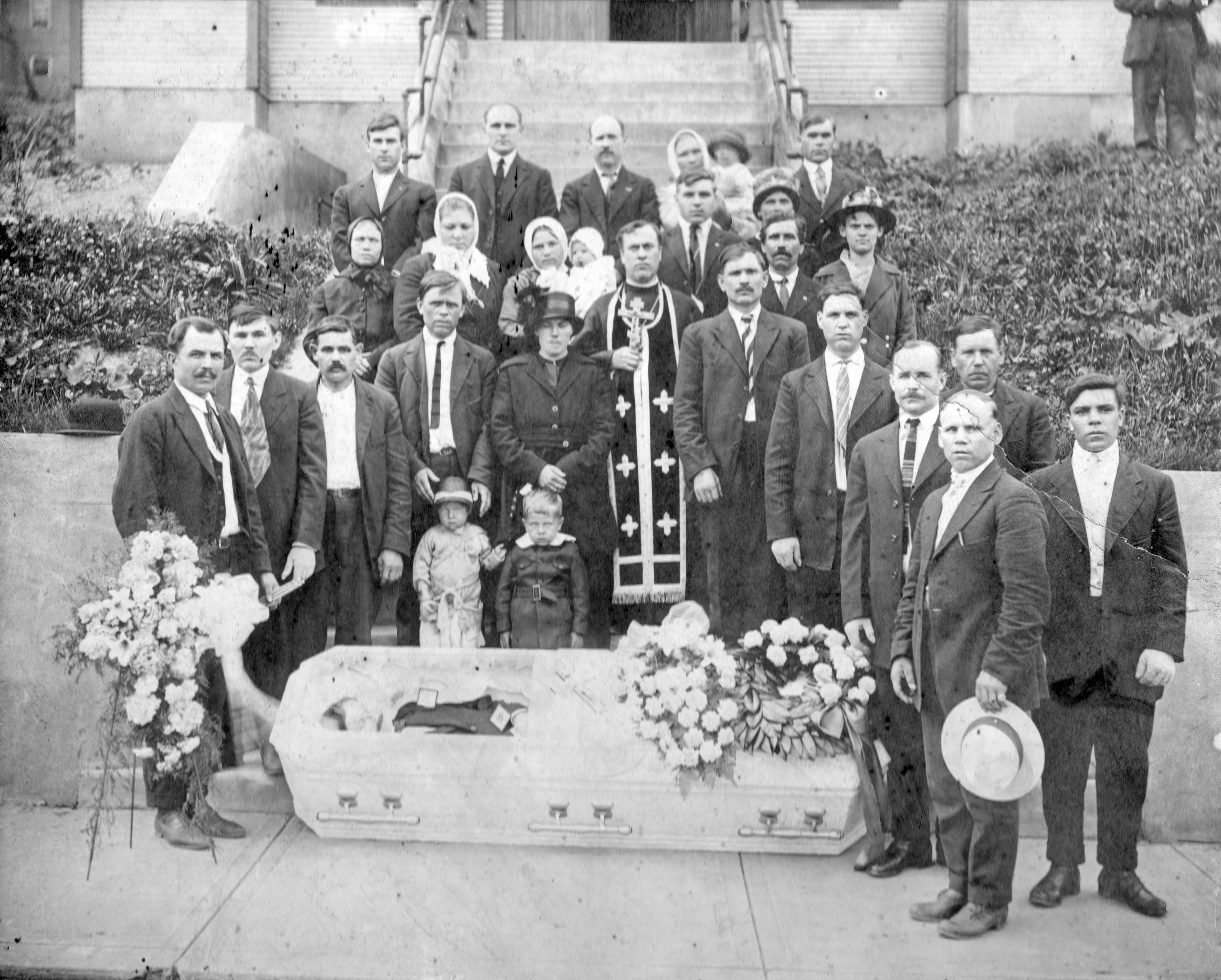 В 1929 году муж Перлы-Пелагеи Фёдор погиб, его задавило вагонеткой в шахте, при добыче угля. Вторая фотография сделана во время похорон Фёдора. На ней у гроба стоит, очевидно, Перла.