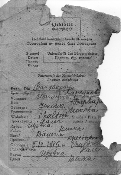 В семье сохранилась фотография Варвары Владимировны (хотя и изрядно ретушированная). А также ещё один документ – удостоверение личности, выданное ей в сентябре 1941 года немцами во время оккупации Хальча.