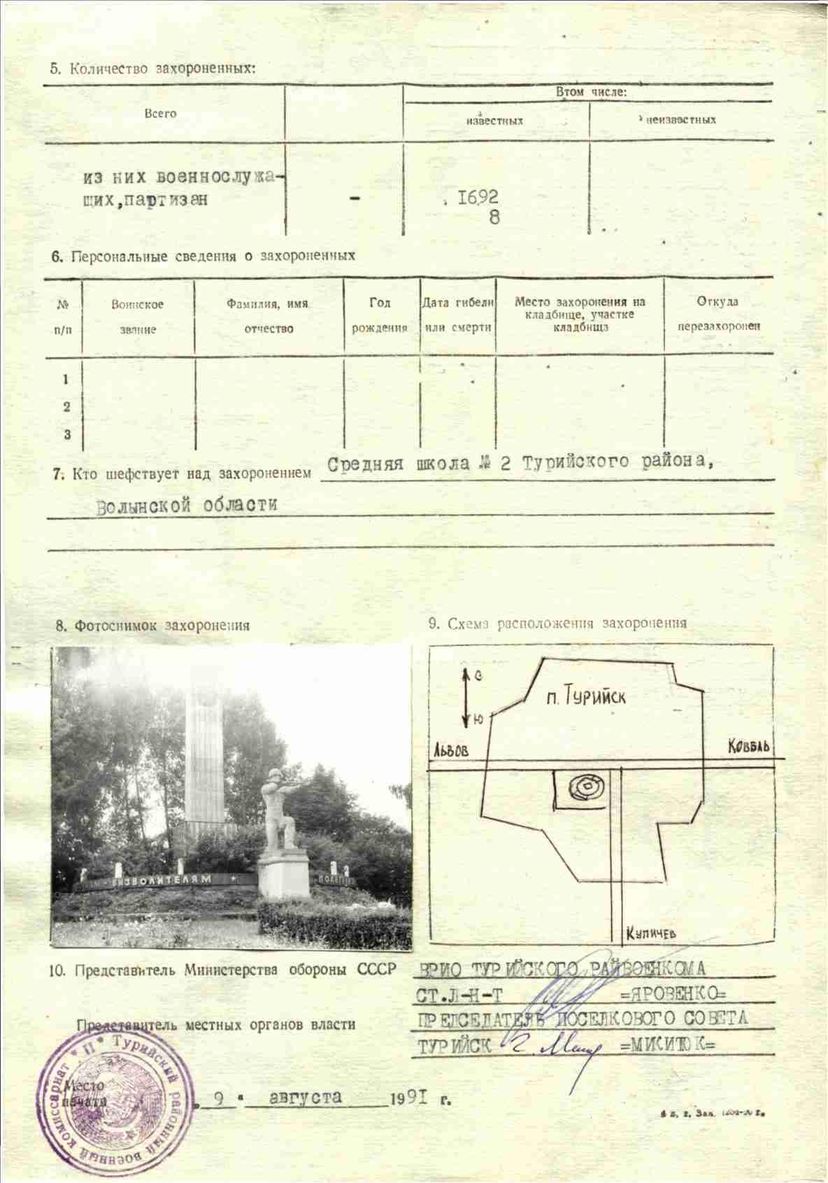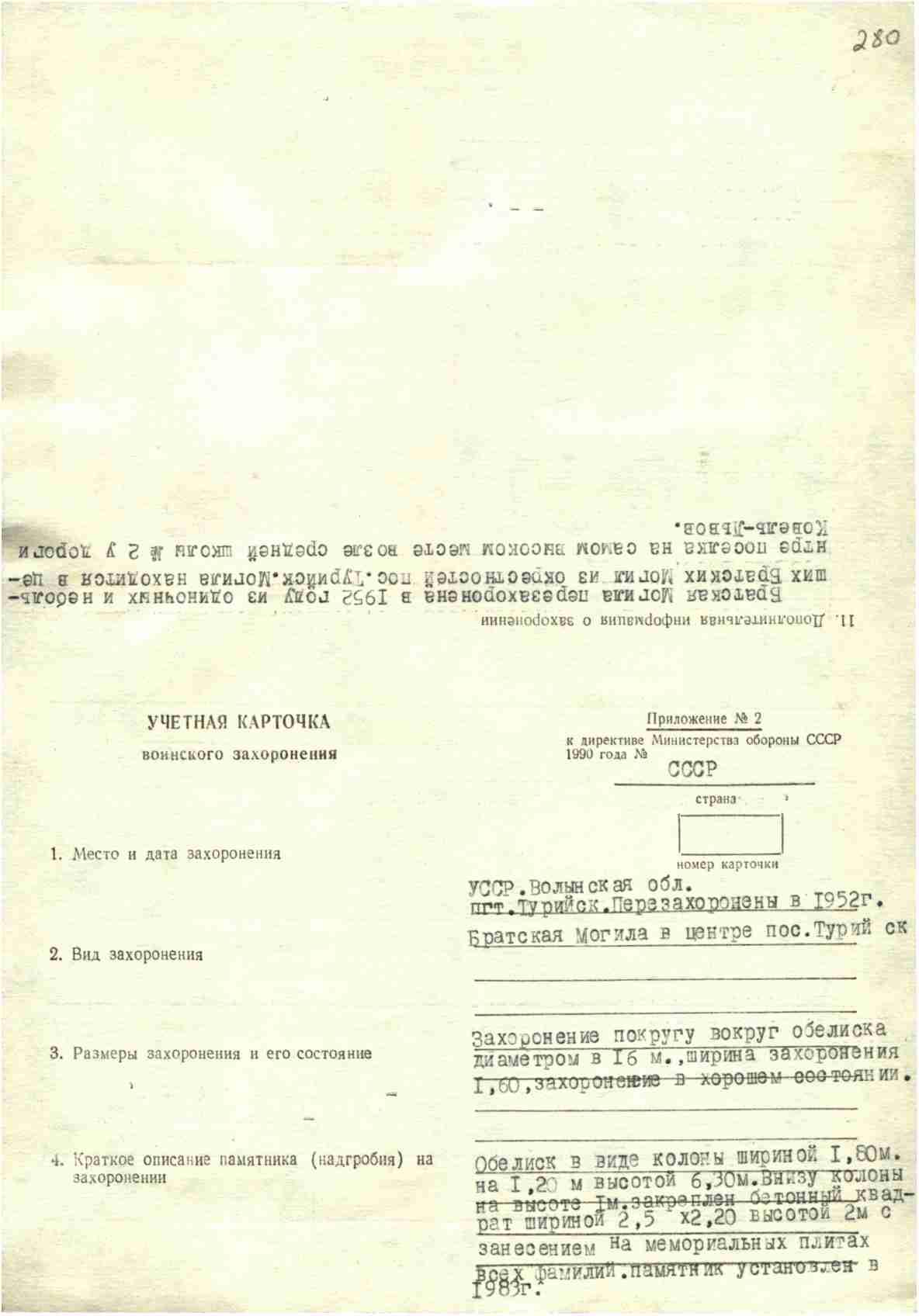 В 1952 году из одиночных и небольших братских могил, находившихся в окрестностях посёлка Турийск, было произведено перезахоронение в братскую могилу, расположенную в центре посёлка, на самом высоком месте, возле школы № 2 у дороги Ковель – Львов. Всего в братскую могилу перезахоронено 1692 военнослужащих и 8 партизан.