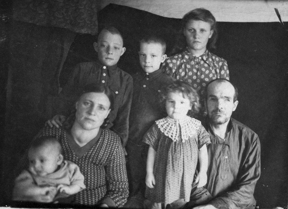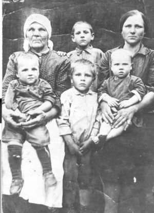 До войны, в период 1930-36 гг. у Михаила и Василины родились дети: Иван, Николай, Владимир и Василий. Сохранилась довоенная фотография, на которой их всех можно увидеть. На фото Арина Тарасовна, мать Михаила (слева) и первая жена Михаила Миновича Василина Максимовна (справа). Остальные – дети Михаила и Василины. В первом ряду слева направо: Василий, Николай, Владимир. Сзади самый старший – Иван.
