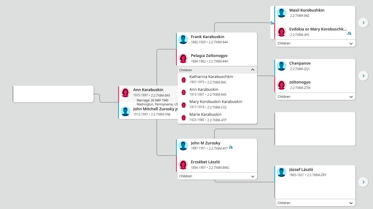 Скриншот страницы, на которой отображено семейное дерево Анны, взят с сайта «FamilySearch» (Семейный поиск) по следующей ссылке: